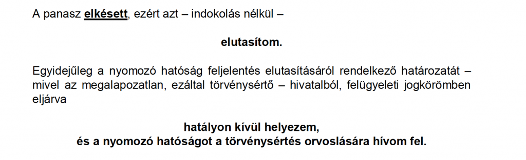 A feljelentő panaszát elutasítja, mivel az a törvényes határidőn túli, viszont magát, az elutasító határozatot „hivatalból felülvizsgálta” és új eljárás lefolytatására kötelezte a NAV-ot.