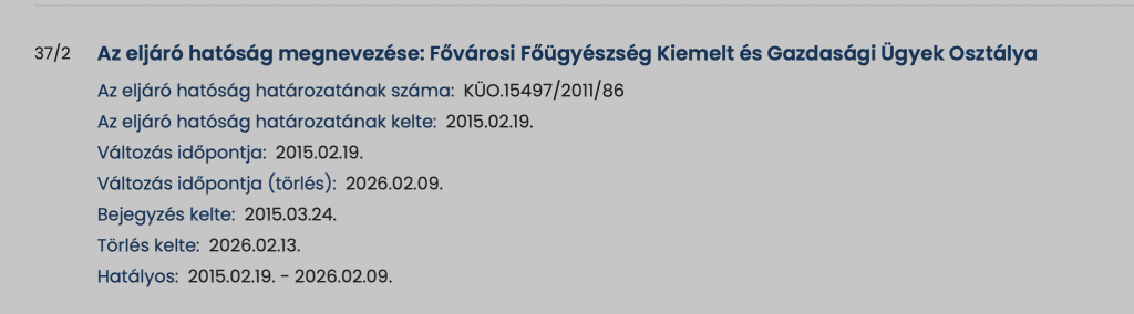 Egy nagyon régen folyamatban lévő büntetőügy első fokú ítélete előtt állunk, az évtizedes büntetőjogi intézkedés bejegyzés 2026 február 09-én megszűnt. Ez nem jelenti a folyó büntetőeljárás megszűnését, ez jelenleg a Fővárosi Törvényszéken, 5.B.389/2015. számon folyik, a törvényszék tájékoztatása szerint, 2026. március 2-án 9.00 órakor lesz a következő tárgyalás a Fővárosi Törvényszék II. 59-es tárgyalótermében. Ezen a napon ítélethirdetés várható.