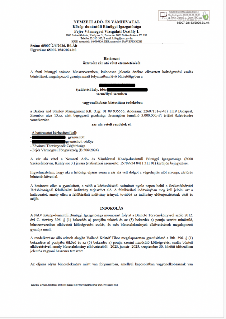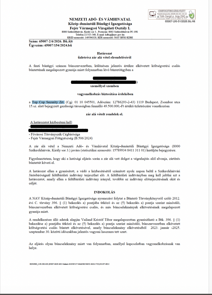A TOP COP Zrt. és ügyvezetése ellen indított eljárás mára ténnyé vált. A cég nyilvános irataiban látható bűnügyi intézkedések háttere a 65007/154/2024.bü számú ügy. A hivatalos minősítés: „bűnszervezetben, különösen jelentős értékre elkövetett költségvetési csalás. bűntettének megalapozott gyanúja „