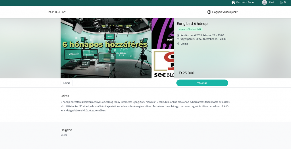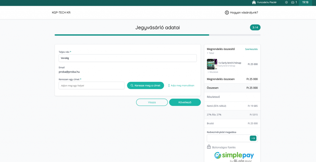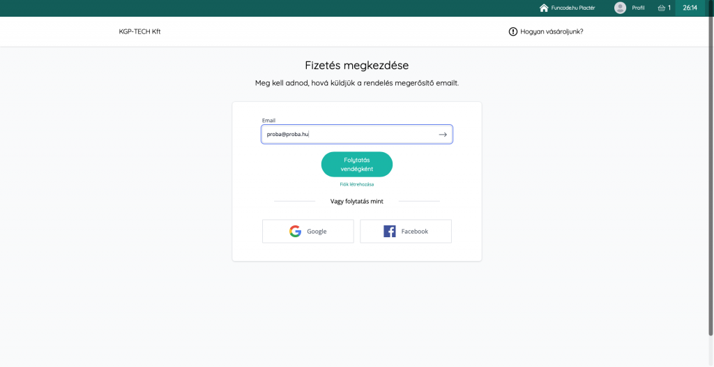 A „Fizetés megkezdése” oldalon adja meg azt az e-mail címét, amelyre a hozzáférést tartalmazó információ és a számla küldhető Önnek. Az e-mail cím megadását követően Ön kiválaszthatja, hogy esetleges későbbi többszöri vásárlás esetére fiókot hoz létre, vagy vendégként vásárol. Többszöri vásárláshoz létrehozott fiókja használatával, a későbbiekben nem kell megadnia adatait.