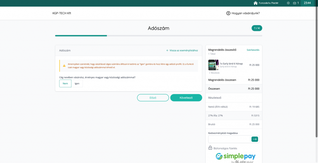 Az Önnek kedvező vásárlási mód kiválasztása, illetve az adószám megadása után megjelent adatok ellenőrzése után kattintson a „Következő” feliratú gombra!