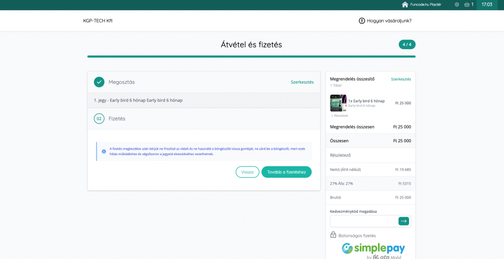 A számlázási adatok megadását követően kérjük ellenőrizze a jobb oldali sávban található fizetési tételeket, amennyiben ezek helyesek kattintson a „Tovább a fizetéshez” gombra!